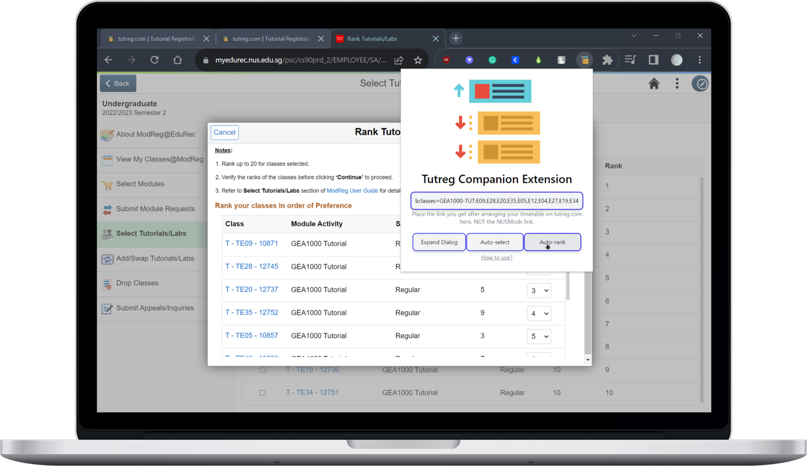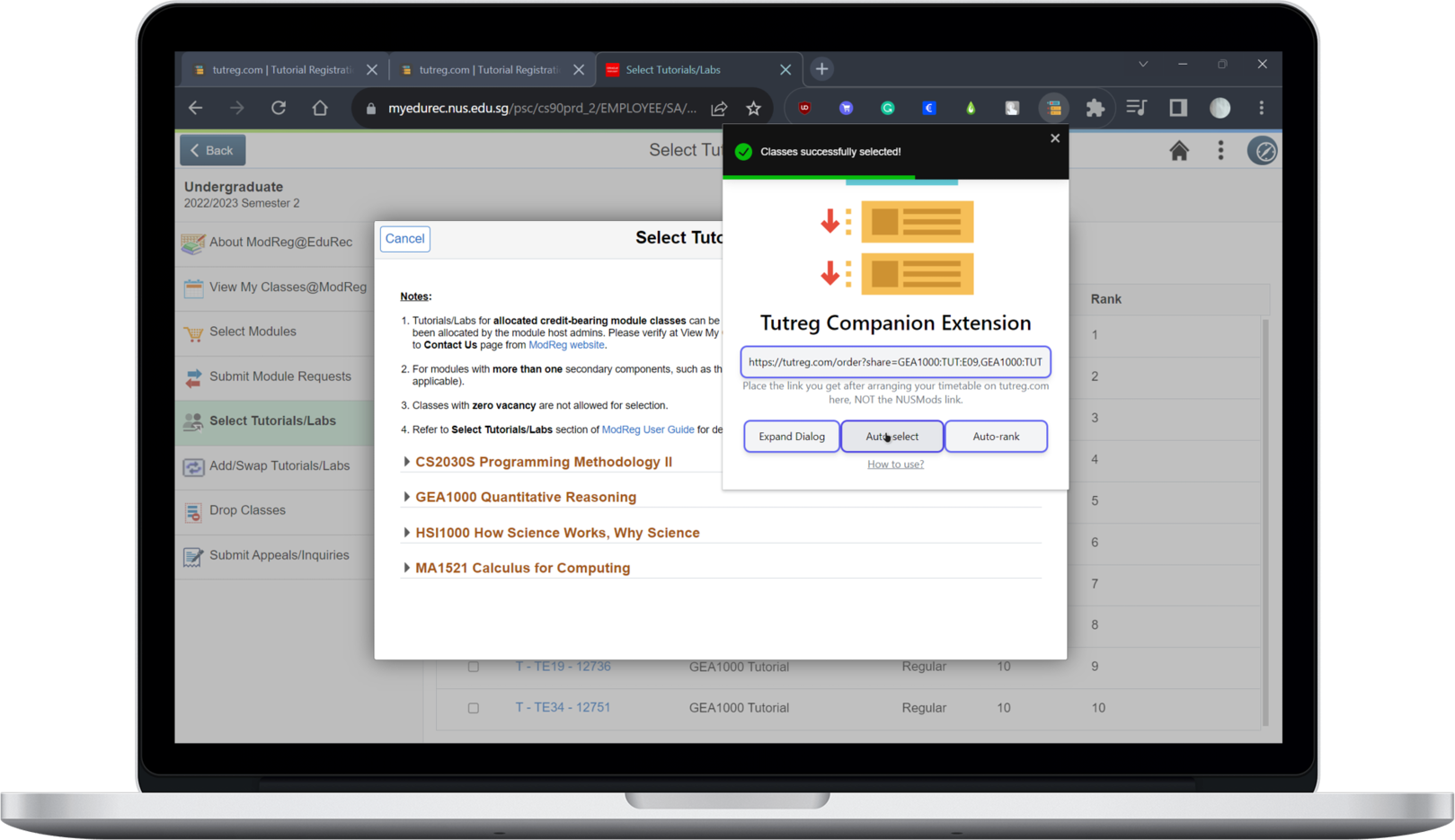 You should see a success message. Close the popup check that your classes are in the correct order If you see an error, try clicking the button again. If it persists, contact the developer at https://t.me/tutreghelp